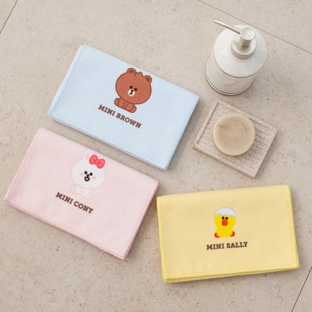 - 귀여운 브라운, 샐리, 코니 캐릭터가 수건에 자수로 새겨져 있습니다.