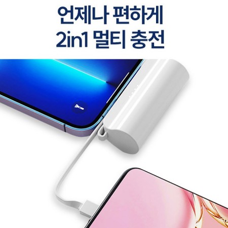 이 보조배터리는 2in1 케이블을 내장하고 있어 별도의 케이블 없이도 스마트폰을 쉽게 충전할 수 있습니다. 케이블 분실 걱정 없이 언제든지 사용할 수 있어 편리합니다.